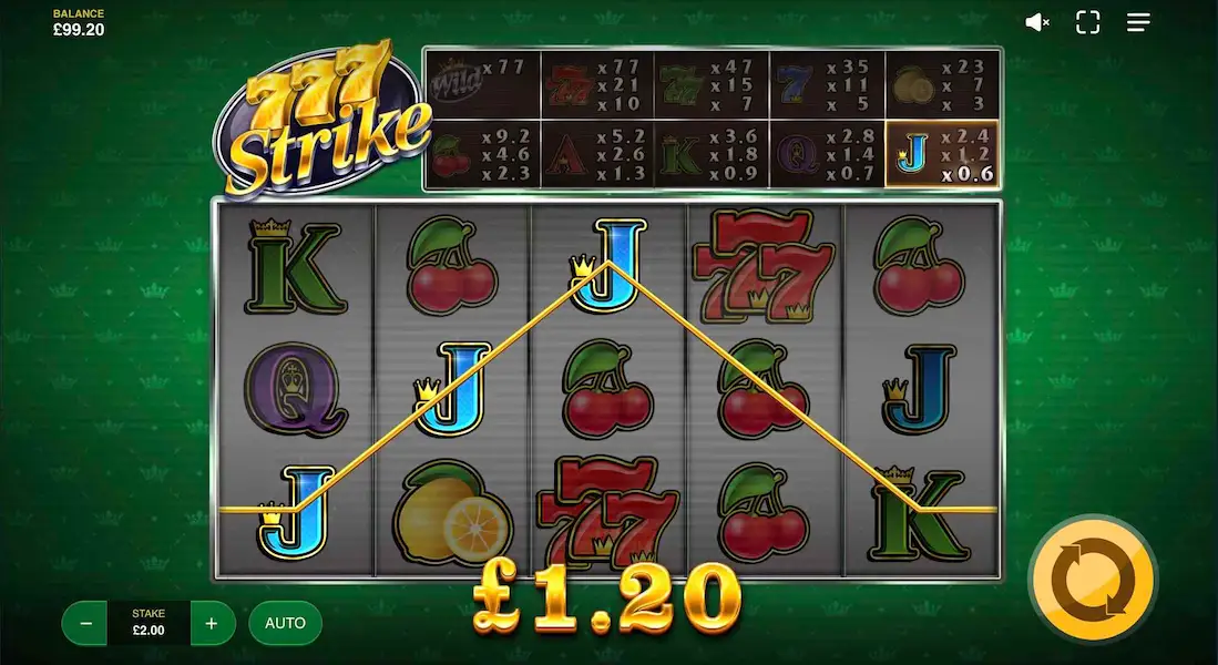 En nuestro análisis profesional hemos visto que Red Tiger no se limitó a recrear otra tragaperras frutal genérica. Los sietes cromados brillan, mientras que las cerezas y los limones mantienen ese atractivo clásico de las máquinas frutales. Estos detalles del diseño se extienden también al audio en el que con cada giro desencadena sonidos mecánicos auténticos, pero la presentación general es totalmente moderna. Encima de los rodillos hay una tabla de pagos muy útil que facilita el acceso instantáneo a la información sobre los pagos. Este cuidadoso equilibrio entre tradición e innovación distingue a 777 Strike en el mercado tan saturado de las tragaperras clásicas.