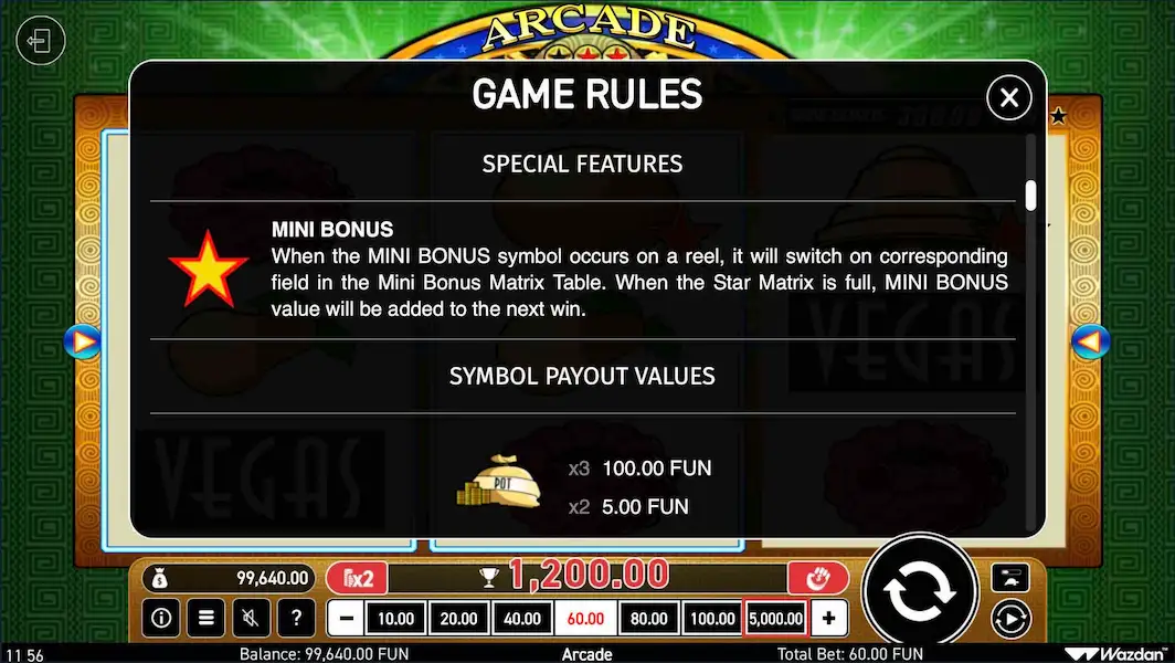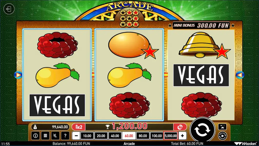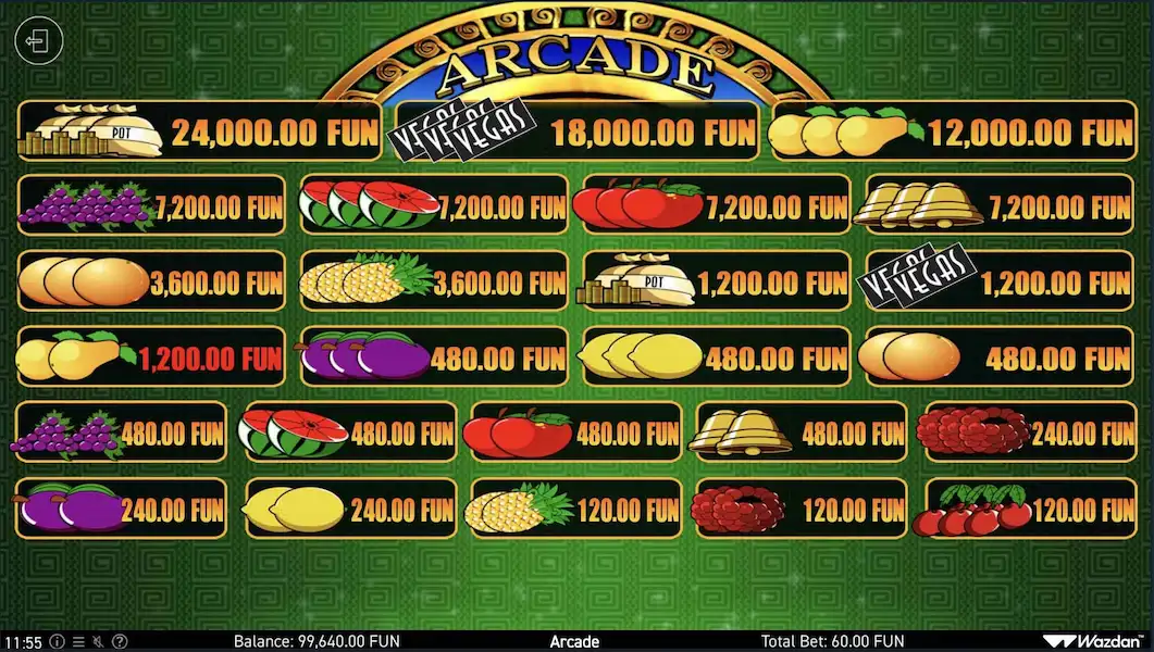 Arcade mantiene el formato clásico de 3 rodillos y 1 línea de pago, pero añade toques modernos. Entre los símbolos se incluyen frutas, campanas, barras y logotipos de "Las Vegas", con el bote dorado como premio principal. El bloqueo de rodillos permite a los jugadores retener rodillos específicos para la siguiente tirada, convirtiendo una simple tirada en algo más táctico.