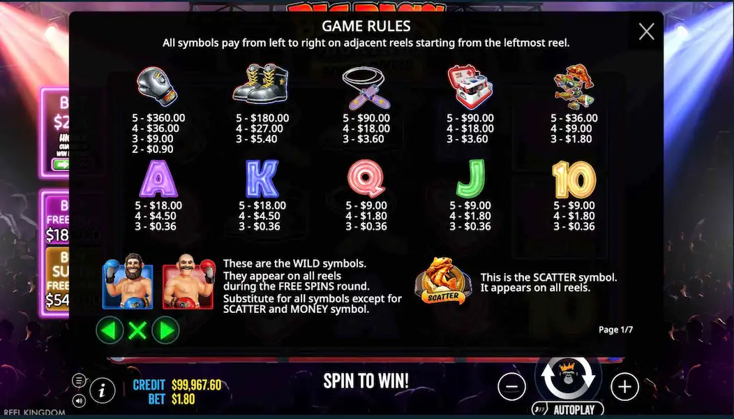 - Símbolo Scatter (Championship Belt): desbloquea las tiradas gratis y la ronda de bonificación de boxeo.