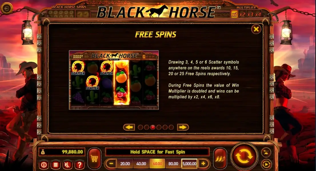 - Tiradas de Caballo Negro: se activa recogiendo símbolos de monedas de oro. Esta ronda de bonificación otorga 10 tiradas en las que todas las monedas de oro se vuelven pegajosas, ofreciendo oportunidades repetidas para obtener mayores ganancias.