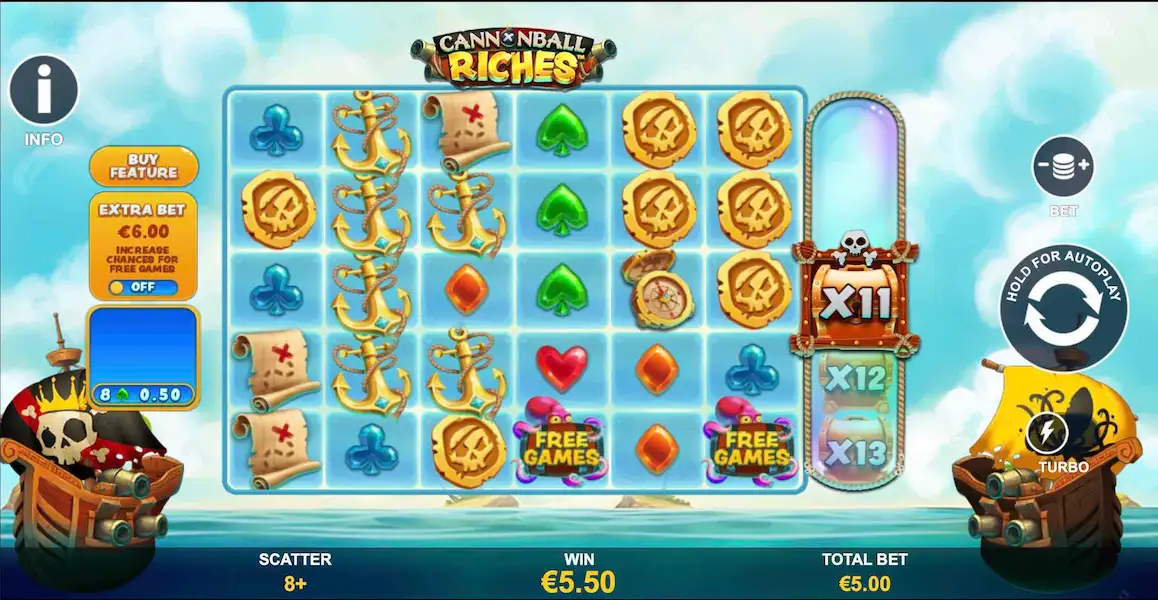 La tragaperras Cannonball Riches comienza con cañonazos, mapas del tesoro y barcos que marcan el tono de una divertida aventura naval. La bonificación de tiradas gratuitas del juego es el verdadero gancho, con multiplicadores y comodines expansivos que pueden equilibrar la balanza en una sola ronda.