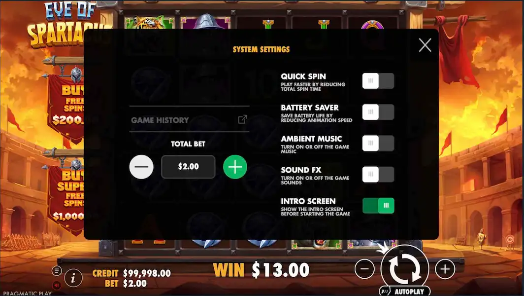 Pragmatic Play tiene fama de ofrecer una animación nítida y sensible, y Eye of Spartacus lo demuestra con creces. Cada giro parece pesado, con los rodillos cayendo como gladiadores entrando en la arena. Los premios especiales desencadenan destellos de luz dorada y, cuando los multiplicadores se acumulan, toda la pantalla se llena de animación. El juego es fluido, rápido y nunca resulta tosco, ni siquiera en dispositivos móviles.