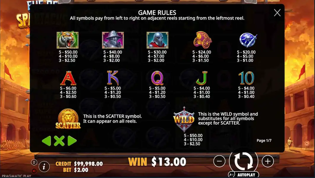 Los premios se obtienen al alinear tres o más símbolos iguales en las 50 líneas de pago. Las ganancias de mayor valor provienen de las combinaciones de Spartacus y Wild, mientras que los multiplicadores en el modo de tiradas gratuitas aumentan las recompensas.