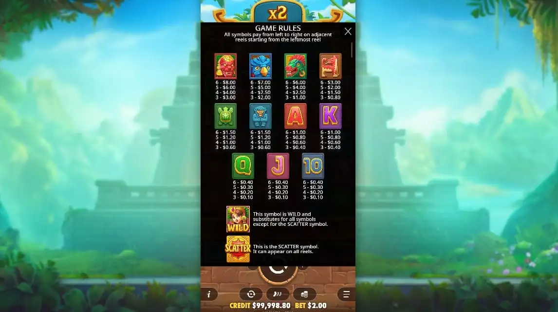 Los ídolos dorados y las máscaras talladas se sitúan en lo alto de la jerarquía de pagos, produciendo las ganancias más grandes. Los comodines se trenzan a través de ellos para prolongar las líneas, mientras que los Scatters desbloquean el verdadero encanto de las tiradas gratis. Incluso los glifos más humildes añaden andamiaje, tapando huecos y manteniendo los rodillos activos. Te recomendamos que leas atentamente la tabla de pagos, donde se distinguen los símbolos que brindan más pagos de los que menos.