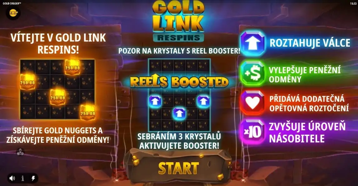 El mecanismo Gold Link Respin se activa al recoger cinco pepitas, despejando el campo para centrarse en el juego de recolección. Los jugadores reciben tres intentos y cada éxito reinicia el contador. Los potenciadores introducen multiplicadores, amplios carretes u oportunidades extra. Las tiradas gratuitas comienzan tras conseguir tres Scatters, otorgando doce rondas en las que las intervenciones explosivas de Gus crean sustituciones de comodines y mejoras de multiplicadores.