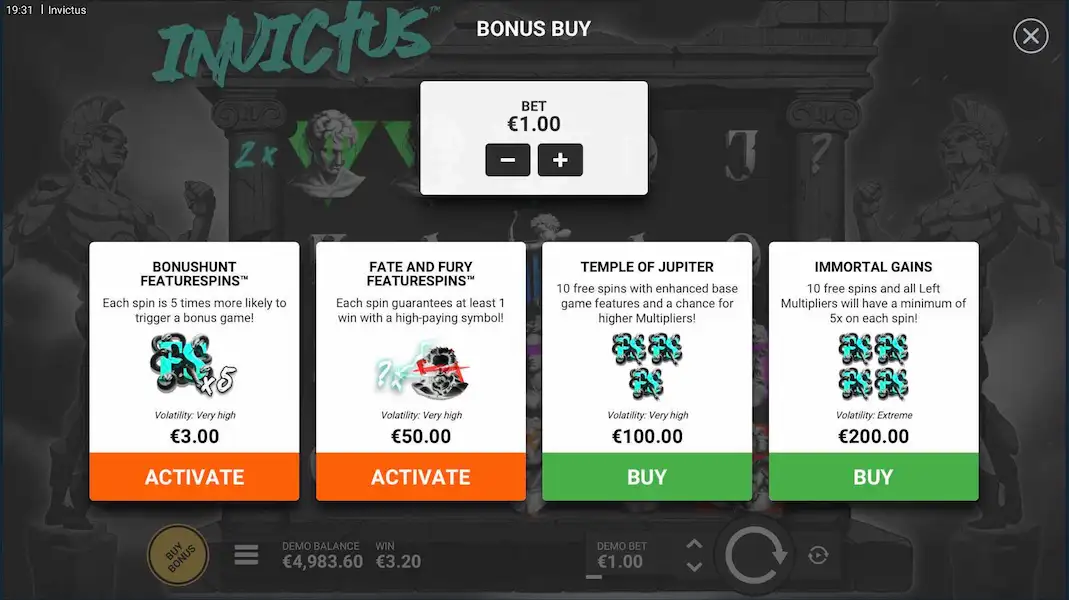 Invictus cuenta con una opción de Apuesta Ante que aumenta tu apuesta en un 25% pero duplica tus posibilidades de activar tiradas gratis. Durante nuestras pruebas, la apuesta ante nos pareció muy útil para reducir los periodos de sequía, aunque es mejor reservarla para jugadores con grandes fondos.