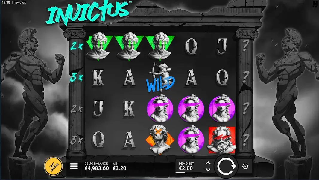 Invictus utiliza un diseño de rodillos de 5x4 con 20 líneas de pago. Los premios se obtienen al conseguir 3 o más símbolos idénticos de izquierda a derecha. La cuadrícula resulta familiar pero está cargada con los giros únicos de Hacksaw.