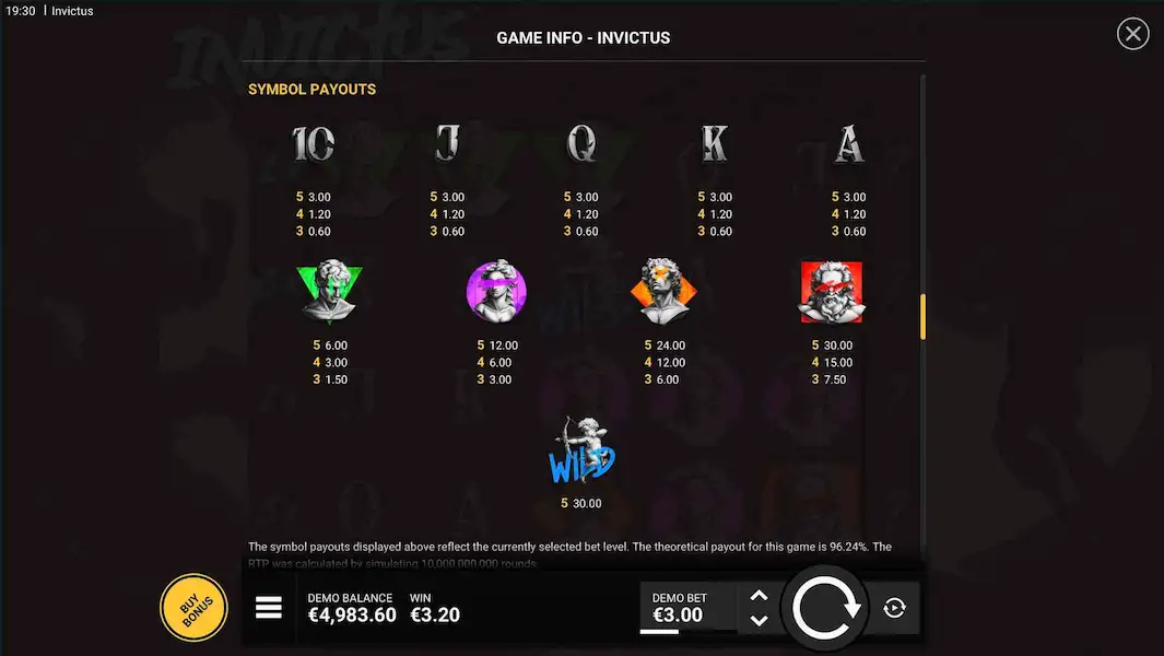 Invictus ofrece un RTP del 96,3%, ligeramente por encima del estándar del sector.