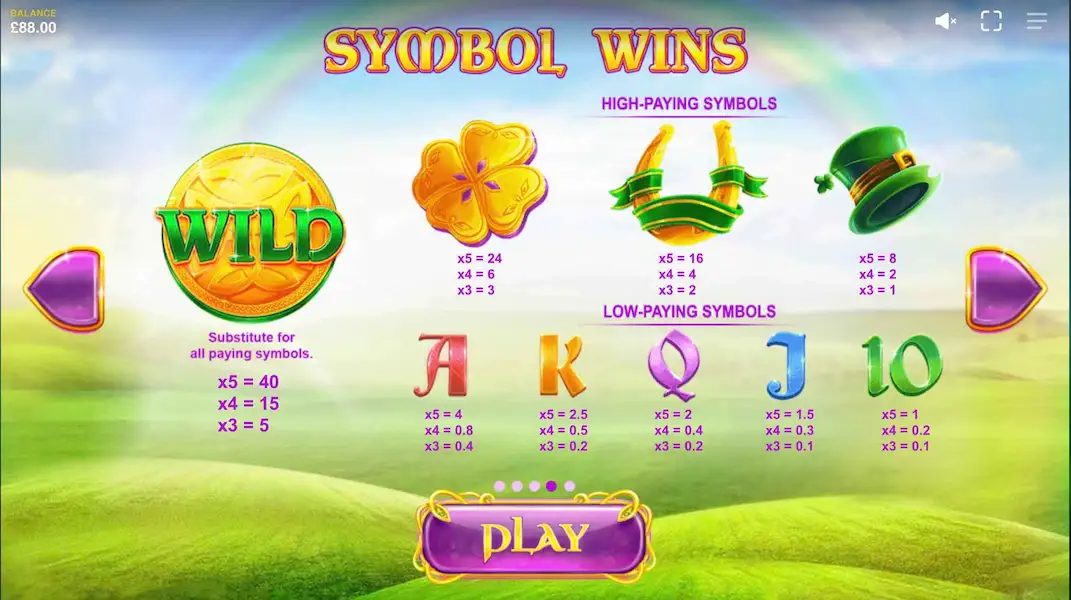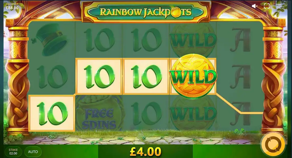 Red Tiger Gaming transporta a los jugadores a las colinas esmeralda donde Rainbow Jackpots se despliega en una cuadrícula tradicional de 5x3 con veinte líneas de pago fijas. Con marcos de madera tallada que abrazan los rodillos mientras tréboles de cuatro hojas, herraduras doradas y monedas celtas pueblan este encantador paisaje irlandés.