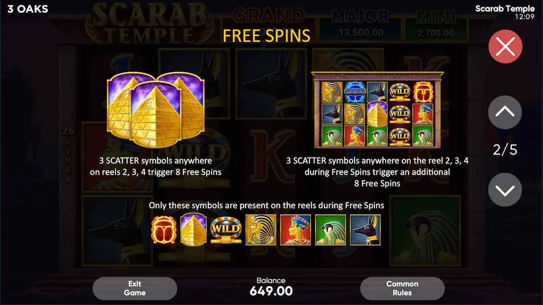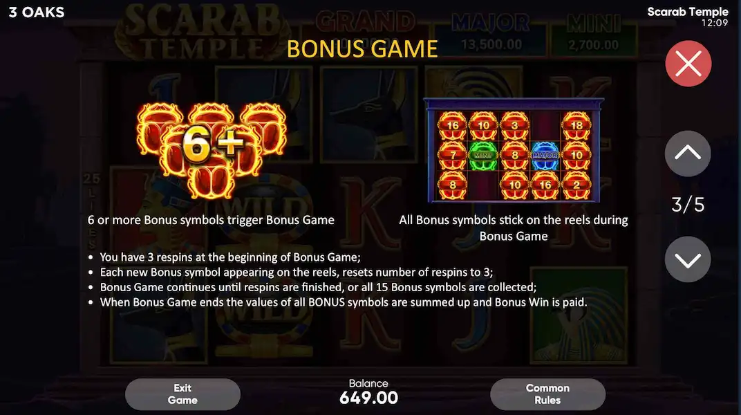 Tras un exhaustivo análisis, nuestros expertos de expertos ha visto que Scarab Temple es un muy buen juego de temática egipcia que equilibra la calidad visual con la equidad matemática. Booongo integra con éxito la mecánica Hold and Win, los respins y las tiradas gratis reactivables en un juego cohesivo. La tasa de devolución del 96% cumple con los estándares de la industria, proporcionando un valor justo al jugador.