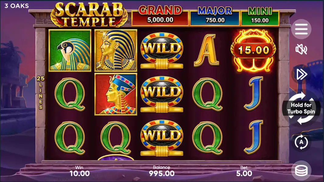 Al explorar la mecánica del juego a través de la versión Demo de Scarab Temple revela que sus apuestas son accesibles ya que van desde los 0,25€ hasta los 60€. La estructura sencilla de 25 líneas fluye convencionalmente de izquierda a derecha, siendo perfecta tanto para los participantes casuales como a los más experimentados.