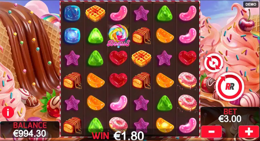Visualmente, la temática de la tragaperras gira en torno a los dulces: caramelos, piruletas y golosinas azucaradas dominan los rodillos. El fondo presenta una atmósfera de tierra de caramelos, dando la impresión de estar dentro de una divertida pastelería. La banda sonora es alegre pero no abrumadora, lo que significa que incluso las sesiones largas resultan cómodas.