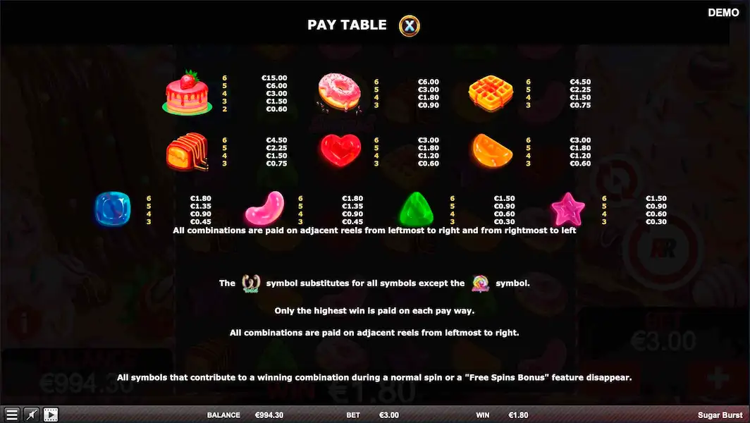 Recomendamos encarecidamente empezar con el modo demo de Sugar Burst que se encuentra disponible en el sitio oficial de Red Rake Gaming y en la mayoría de los casinos online con licencia que alojan el juego. Probar la demo nos permitió: