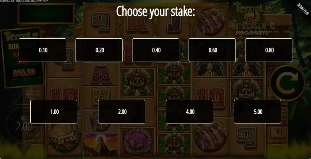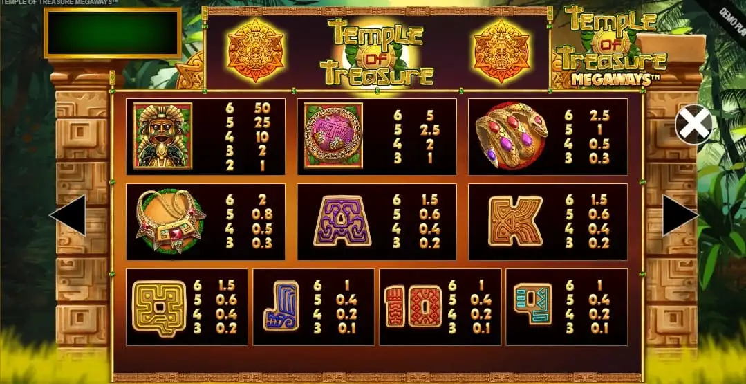 Los templos aztecas se alzan en el fondo, con máscaras decoradas con joyas e íconos dorados cayendo en los rodillos. La tragaperras Temple of Treasure Megaways no está basada en una narrativa profunda, sino que crea un escenario con símbolos que refuerzan la atmósfera de búsqueda de tesoros.