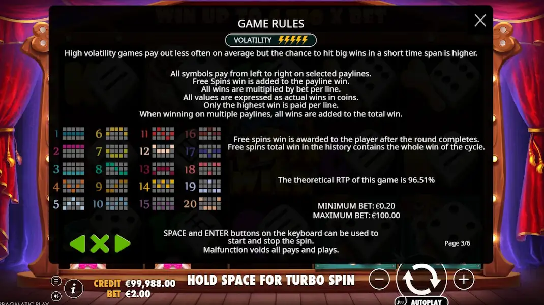 La tragaperras funciona en una cuadrícula de 5×3 con 20 líneas de pago fijas. Las apuestas van de bajas a altas, lo que la hace accesible a una gran variedad de jugadores. Las ganancias se producen cuando aparecen símbolos iguales de forma consecutiva desde el rodillo situado más a la izquierda. La alta volatilidad asegura que las ganancias sean menos frecuentes pero potencialmente sustanciales cuando aparecen. Según nuestras pruebas, el RTP del 96,51% proporciona rendimientos justos a largo plazo. En nuestra opinión, es una tragaperras ideal para los jugadores que buscan un juego dinámico, entretenido y potencialmente lucrativo.