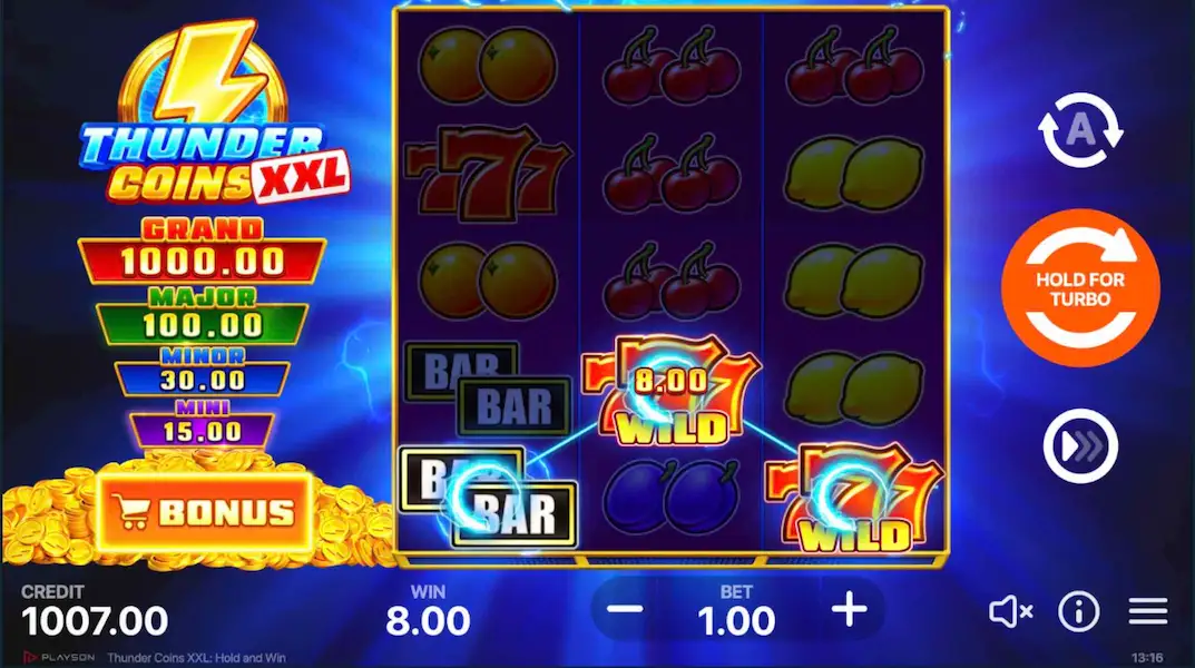 Playson rediseña las máquinas tragaperras tradicionales a través de Thunder Coins XXL desplegando un inusual diseño 3x5 rodeado de corrientes eléctricas y brillantes acentos dorados. Esta iteración mejorada se basa en los cimientos de su predecesora, incorporando íconos frutales familiares junto con pilas de monedas luminosas. También cuenta con pantallas de Jackpot progresivo situadas en un lugar destacado por encima de la zona de juego.
