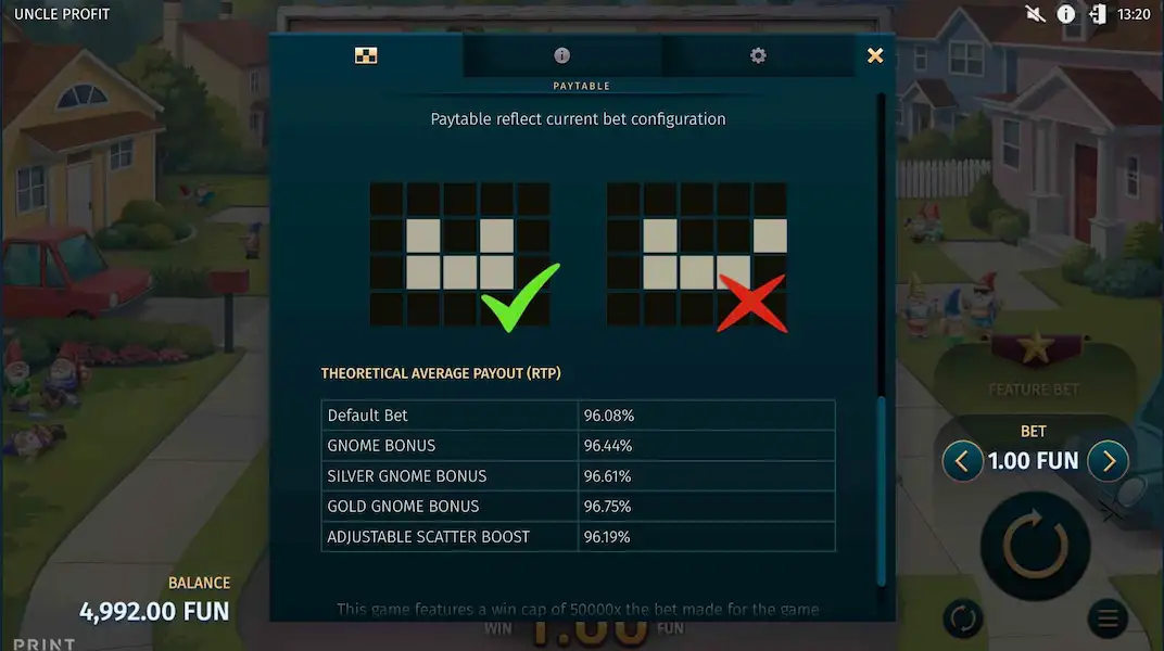 Uncle Profit ofrece una rentabilidad teórica del 96,08%, aunque los operadores pueden implementar variantes del 94,16% o del 86,09%. La volatilidad media-alta de 8/10 crea sesiones prolongadas con un potencial de ganancias significativo que alcanza las 50.000 veces la apuesta.