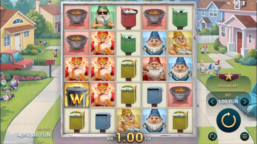 Print Studios ha creado un absurdo campo de batalla suburbano en Uncle Profit, donde el césped cuidado se encuentra con el caos en una cuadrícula de 5x5 con pagos por grupo. Los gnomos de jardín se divierten mientras el personaje principal libra una guerra contra los invasores de porcelana, mezclando una temática de encanto con algo de violencia inesperada.