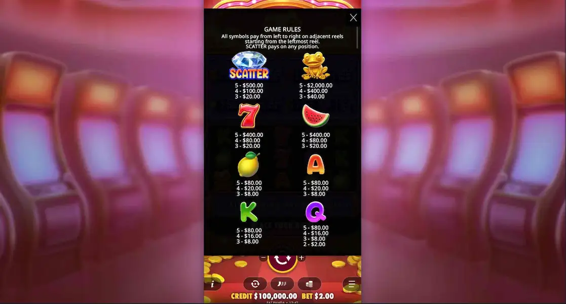 Wealthy Frog funciona con reglas sencillas. El objetivo es alinear símbolos iguales en las líneas de pago, y encontrar que los símbolos Scatter desbloqueen las bonificaciones. Debido a este enfoque directo, los jugadores principianttes encontrarán fácil comprender su dinámica y jugar sin consultar las reglas constatemente.